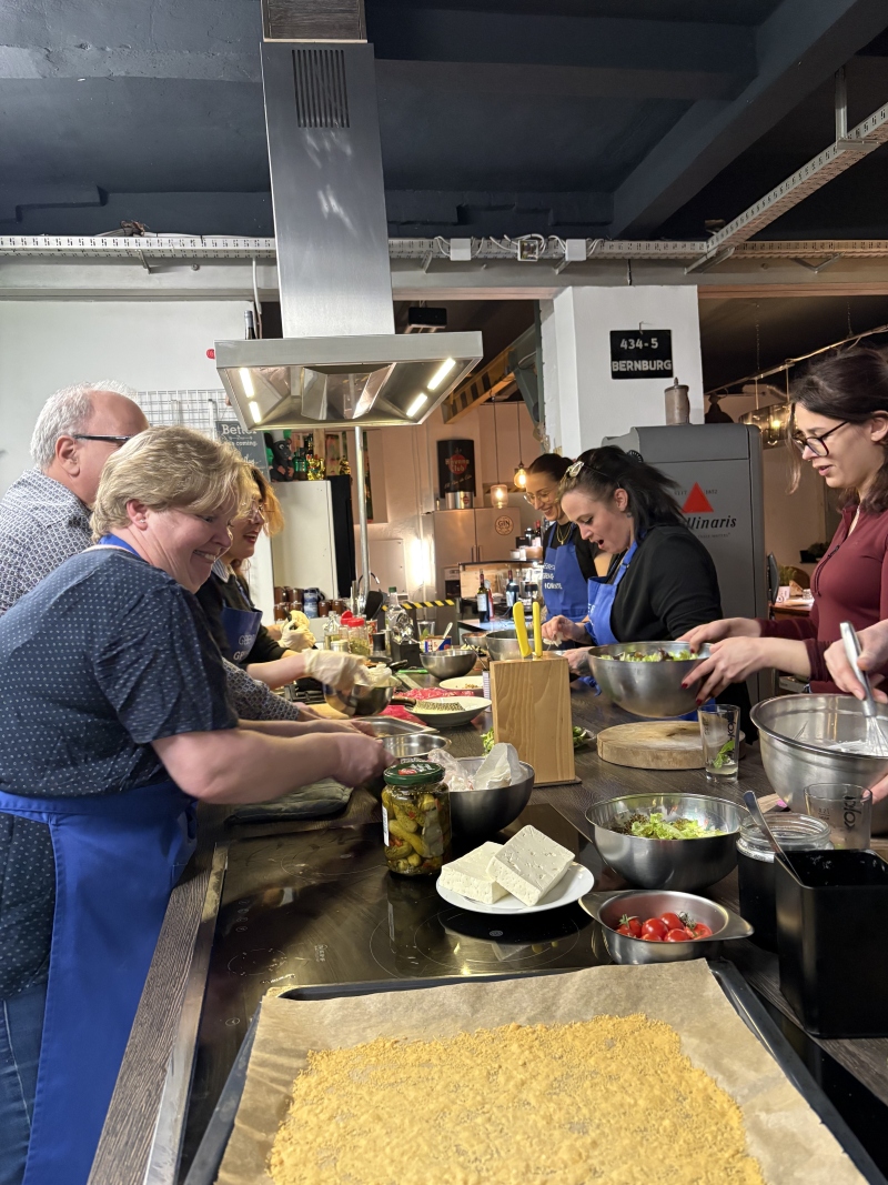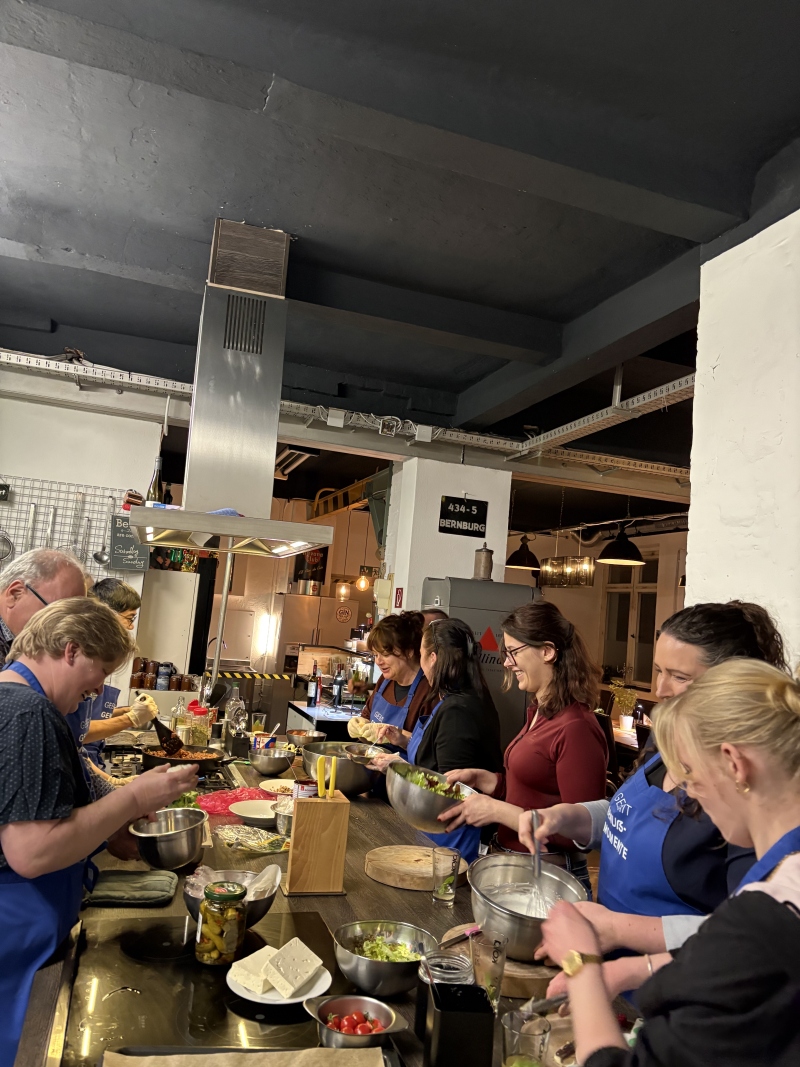 Den krönenden Abschluss fand der Azubi-Perspektivtag jenseits von Schreibtisch und Bewohnerbett. Am Abend tauschten die Azubis ihre Arbeitskleidung gegen Kochschürzen: Im Kochatelier Günther stand ein gemeinsames Kochevent auf dem Programm. Unter professioneller Anleitung wurden nicht nur Zutaten geschnitten und Töpfe gerührt, sondern vor allem das Teamgefühl gestärkt.